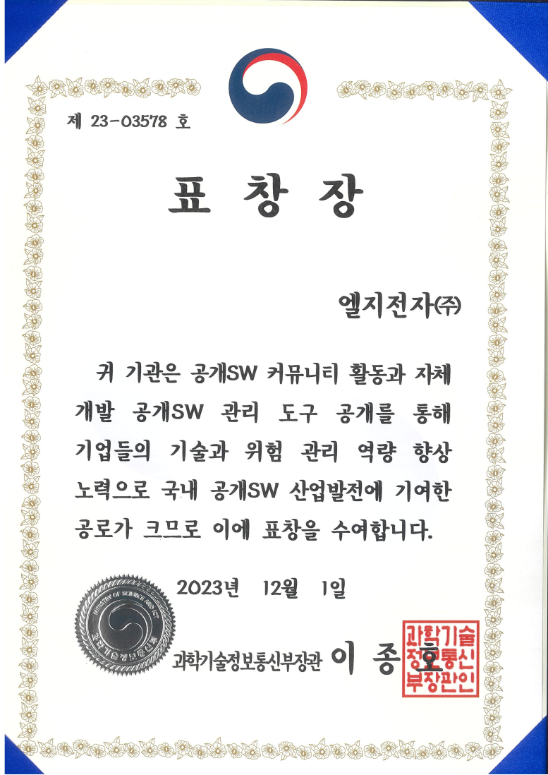 On December 1, 2023, LG Electronics was recognized for its contributions to the development of the domestic open source software (OSS) industry by receiving the Minister of Science and ICT Award at the ‘2023 Domestic Open Source Software Industry Development Contributors Award Ceremony.’ This award acknowledges LG Electronics’ active participation in the OSS community and the development and release of its own OSS management tools, FOSSLight Hub and FOSSLight Scanner.