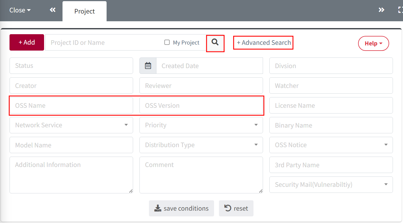 - You can search for projects containing a specific open source component using search conditions.
